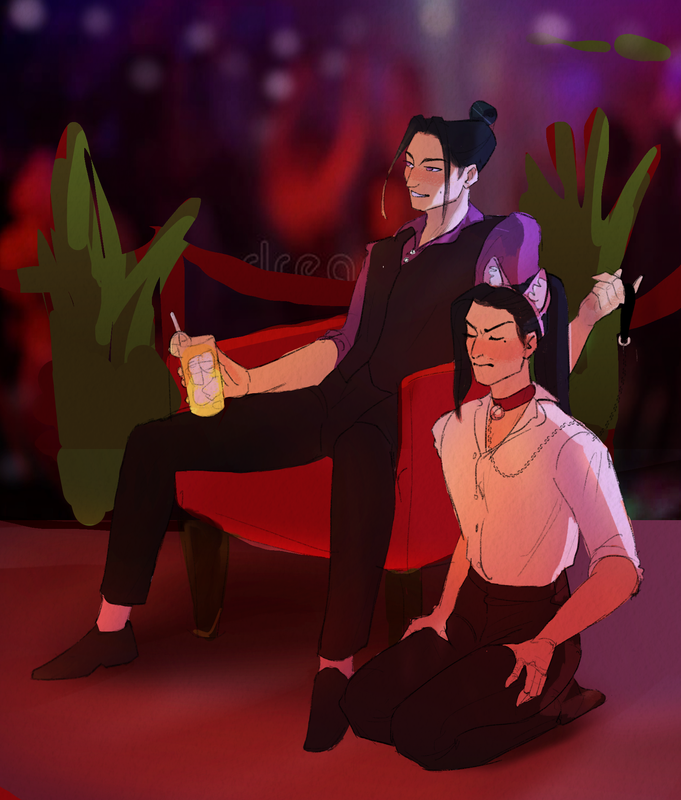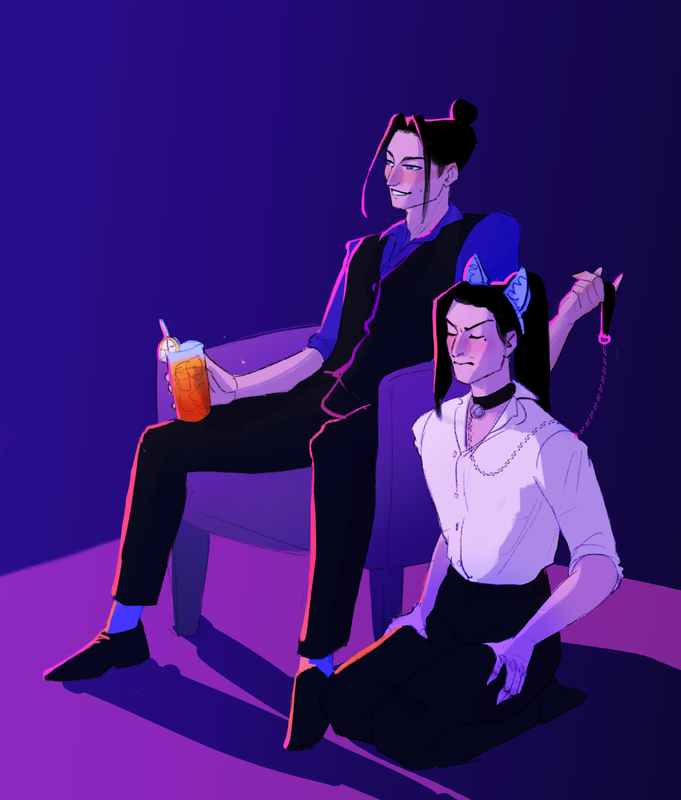 Jiang Cheng sprawls comfortably on a bar lounge armchair, chatting with someone off-screen. Next to him, kneeling primly on the floor, is Liu Qingge. His perfect posture is betrayed by the death grip he has on his own thighs and the angry blushing scowl on his face. He's wearing dog ears and a leash, the end of which is loosely held on Jiang Cheng's hand.